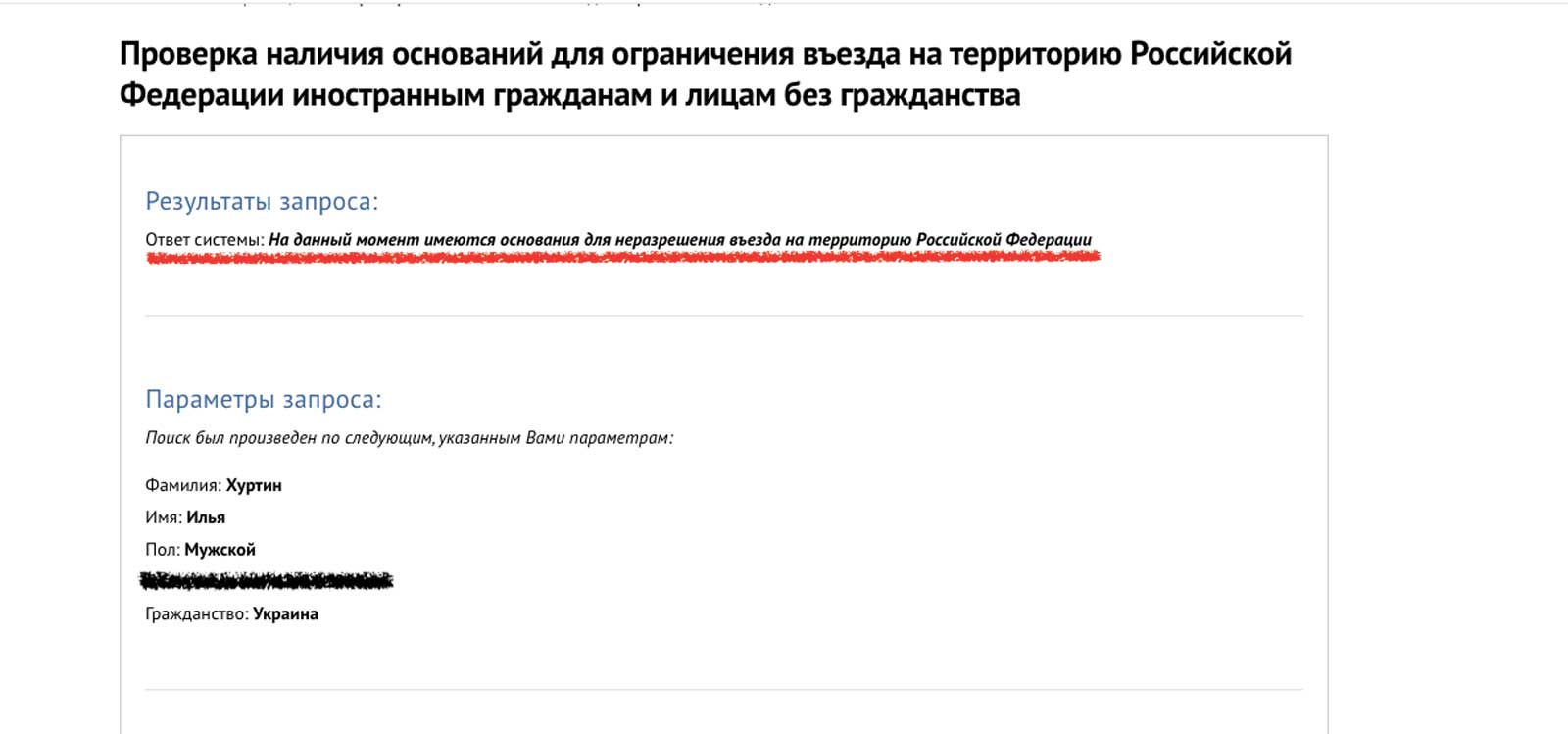 Илье Хуртину теперь официально запрещен въезд в Россиию. Источник: Соцсети, база МВД РФ.