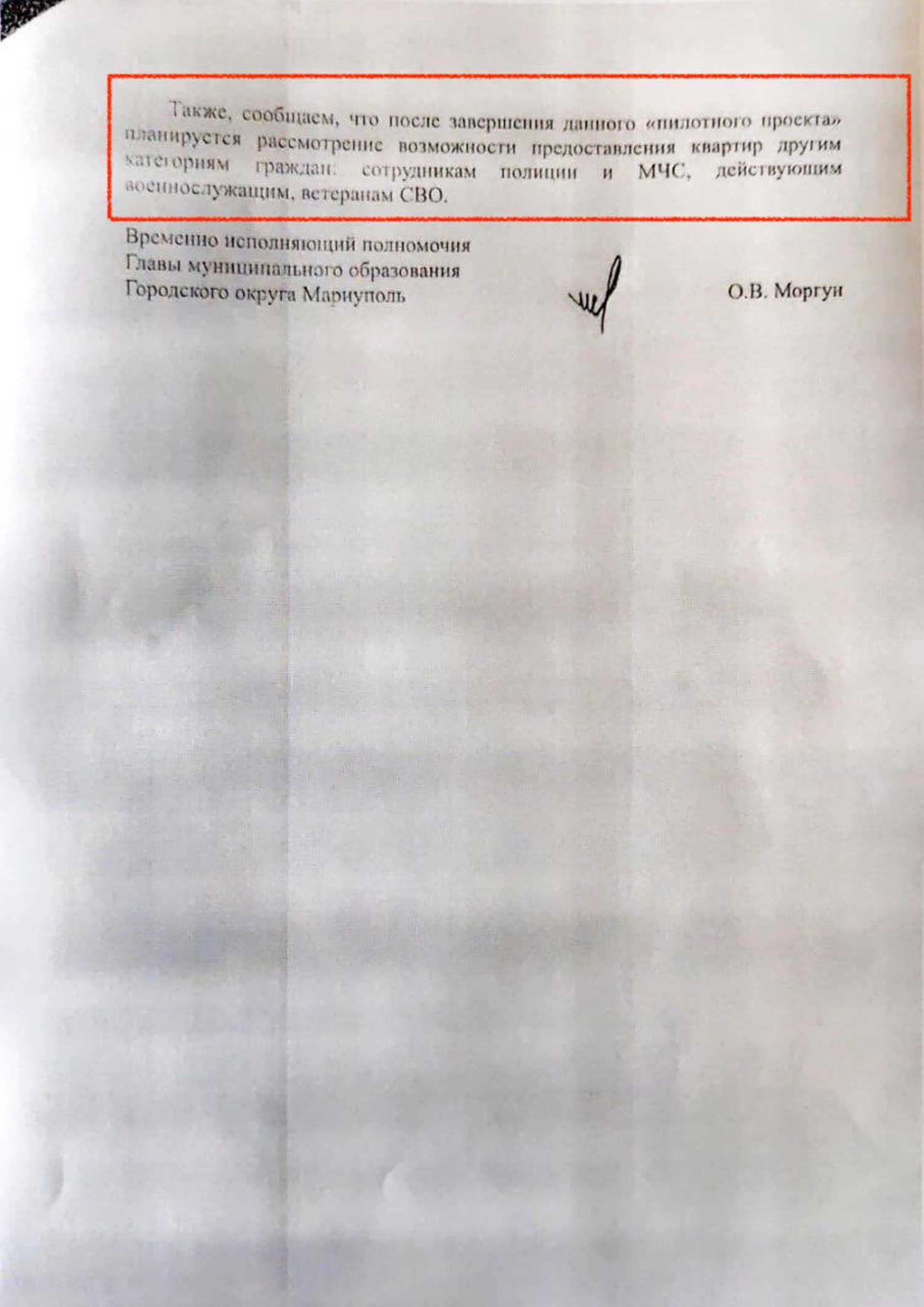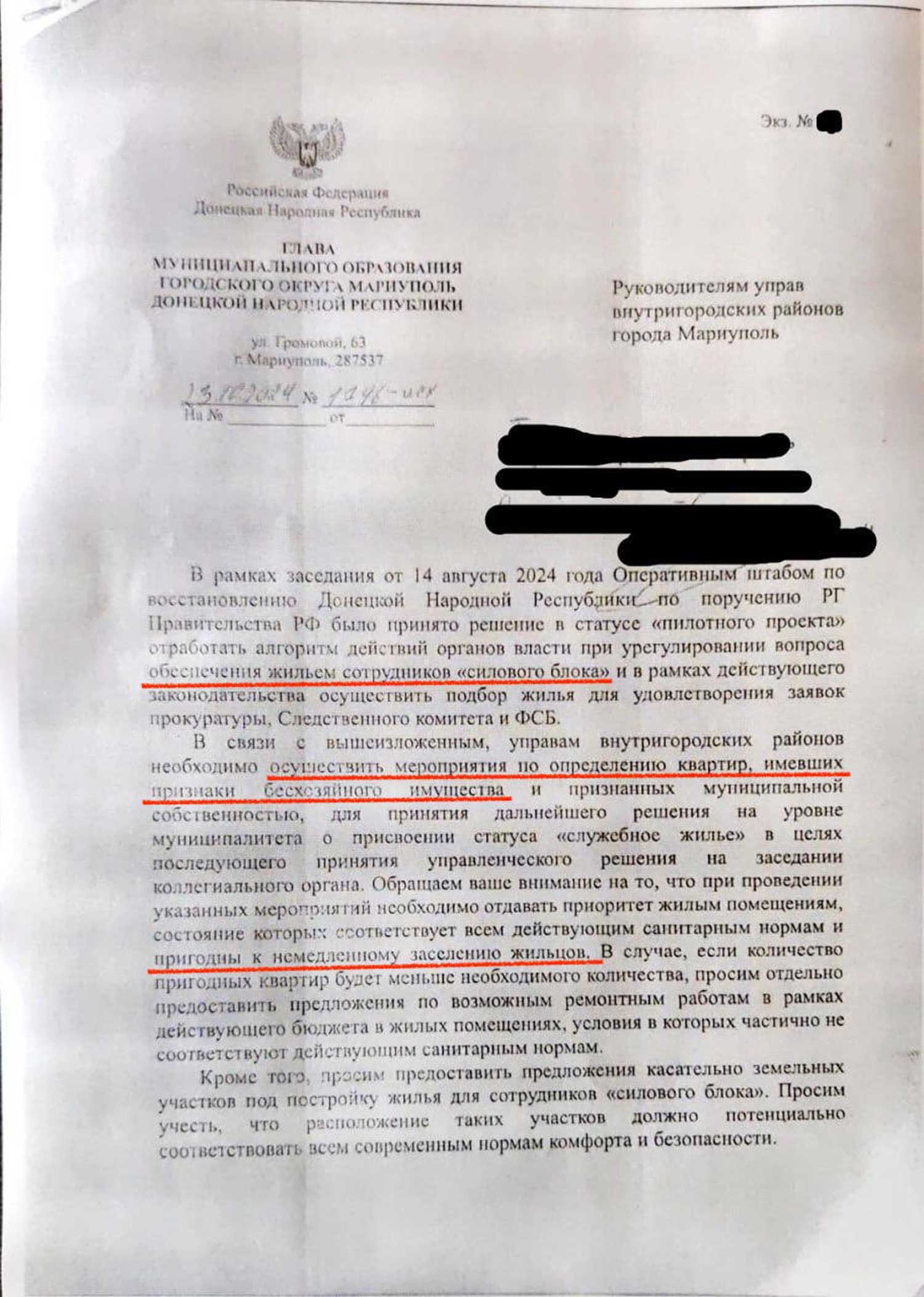 Осенью 2024 года телеграм-канал Петра Андрющенко опубликовал документы, которые руководителям управ города, предположительно, спустил оккупационный глава Мариуполя. Там говорилось о запуске пилотного проекта по раздаче «бесхозяйного» жилья сотрудникам прокуратуры, Следственного комитета и ФСБ. По словам Андрющенко, эти бумаги ему передали источники на местах. Если пилотный проект окажется успешным, такие квартиры могут начать давать еще и полиции, МЧС, военнослужащим и «ветеранам СВО», следовало из документа.