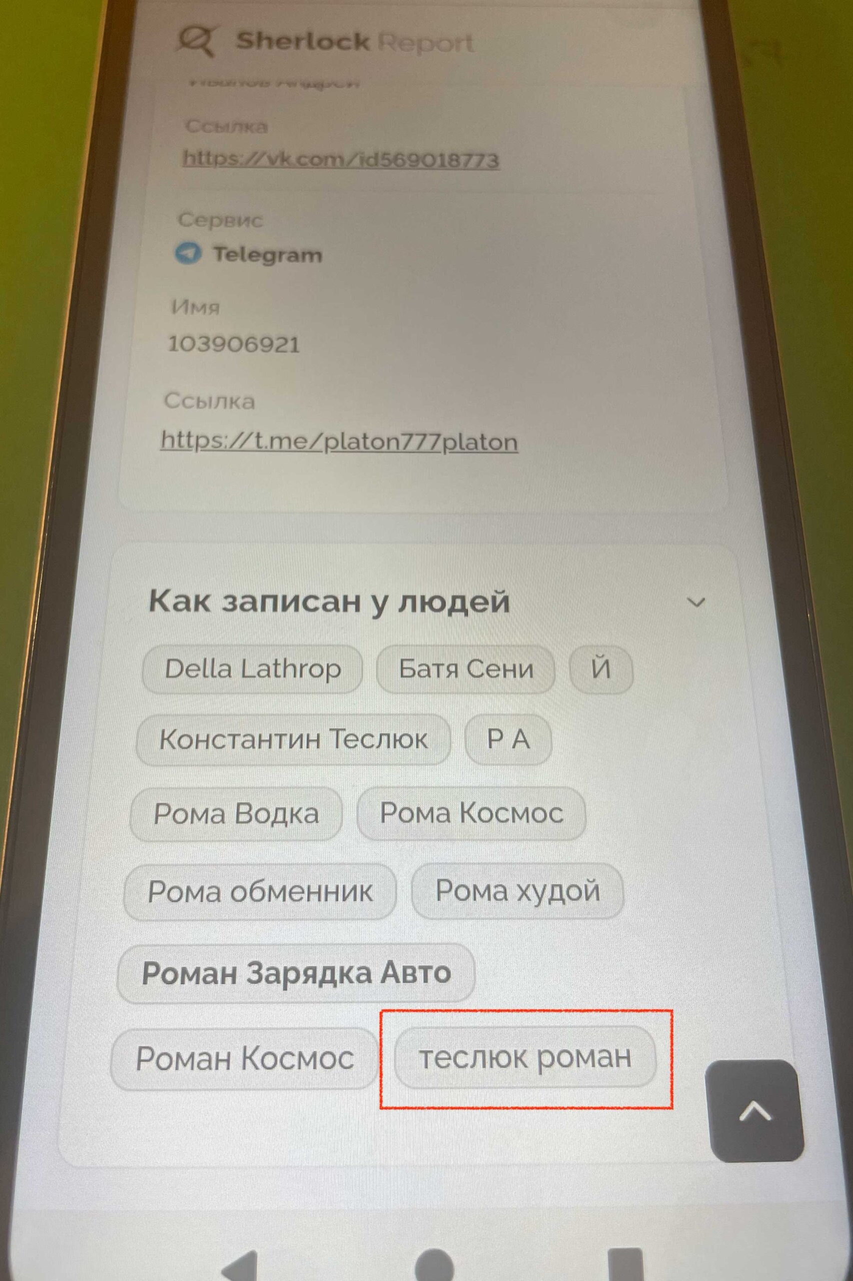 С помощью ботов «пробива» мы выяснили, что человека с ником platon777platon зовут Роман Теслюк