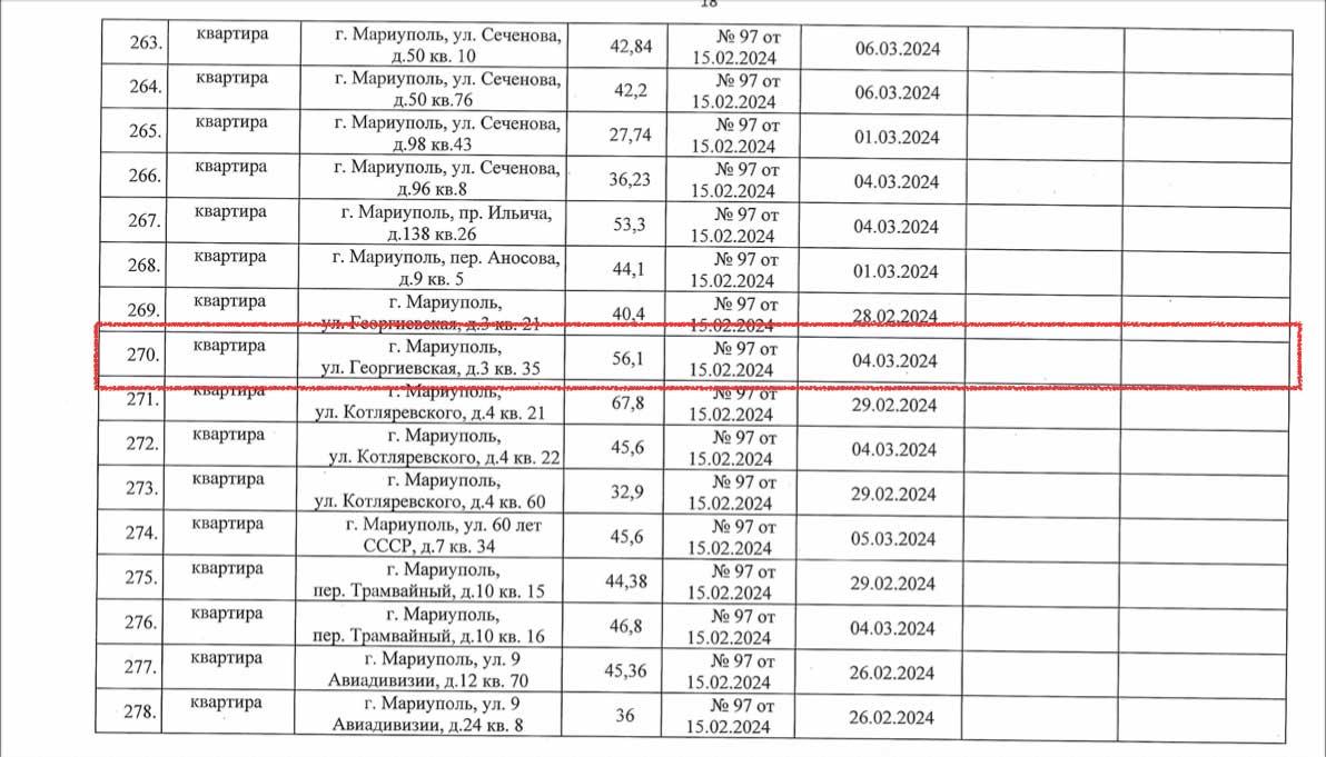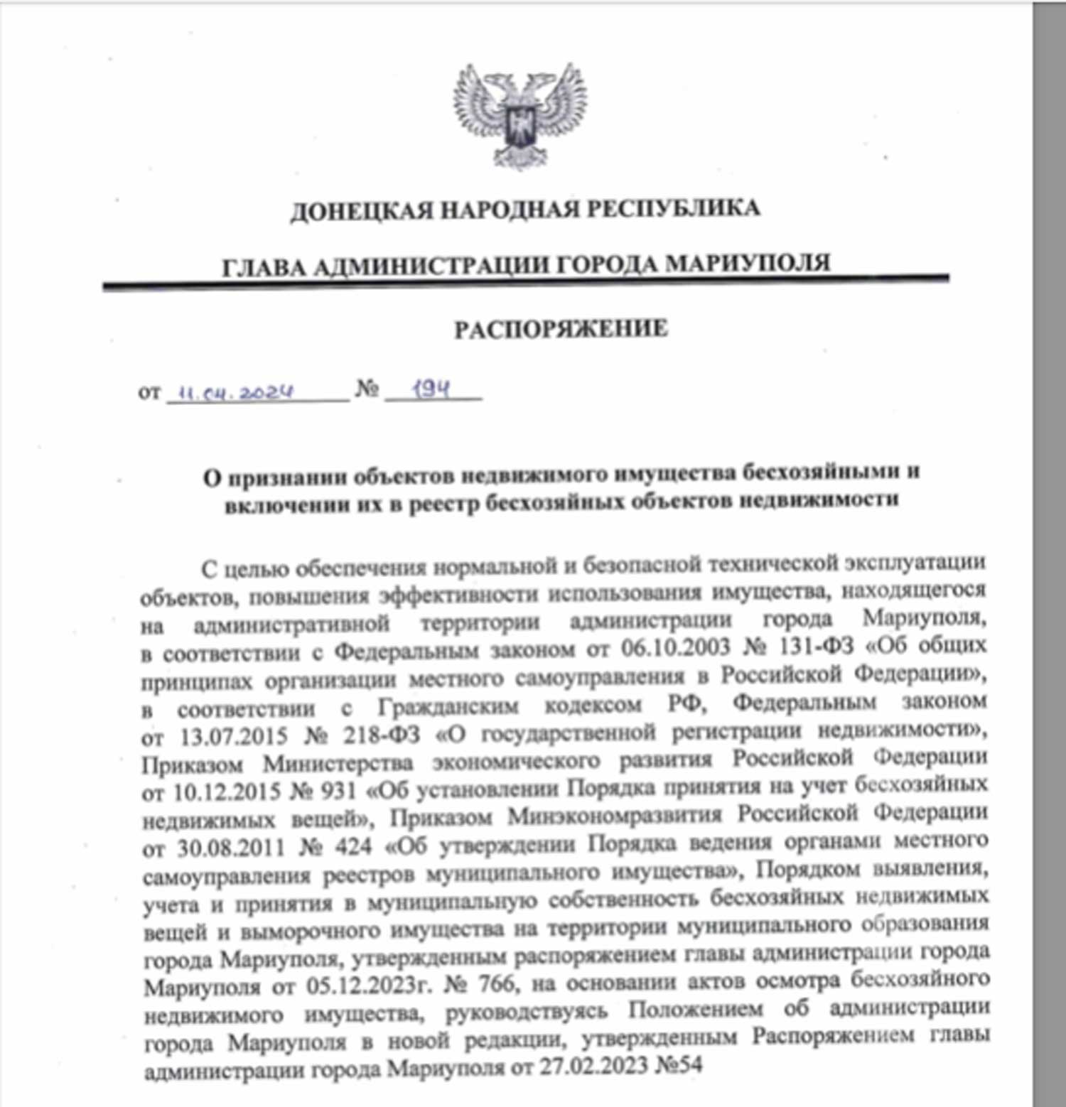 Фрагмент распоряжения оккупационной власти, отправившего квартиру Татьяны в «бесхоз». Источник: https://mariupol-r897.gosweb.gosuslugi.ru.