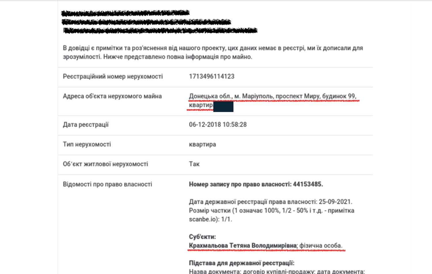 Существует важный момент, о котором Крахмалёвы не упоминают в своих роликах. Их полным тезкам принадлежат сразу три квартиры в Мариуполе, обратили внимание в «Досье», изучив реестр недвижимости Украины. Одна из них — на проспекте Мира, 99 оккупационные власти вернули советское название проспект Ленина × — с января 2025 года числится в потенциальном «бесхозе». Татьяна — единственная собственница. Поскольку женщина не может попасть в Мариуполь и оформить недвижимость по российским законам, жилье либо уже отошло, либо в ближайшее время отойдет городским властям.