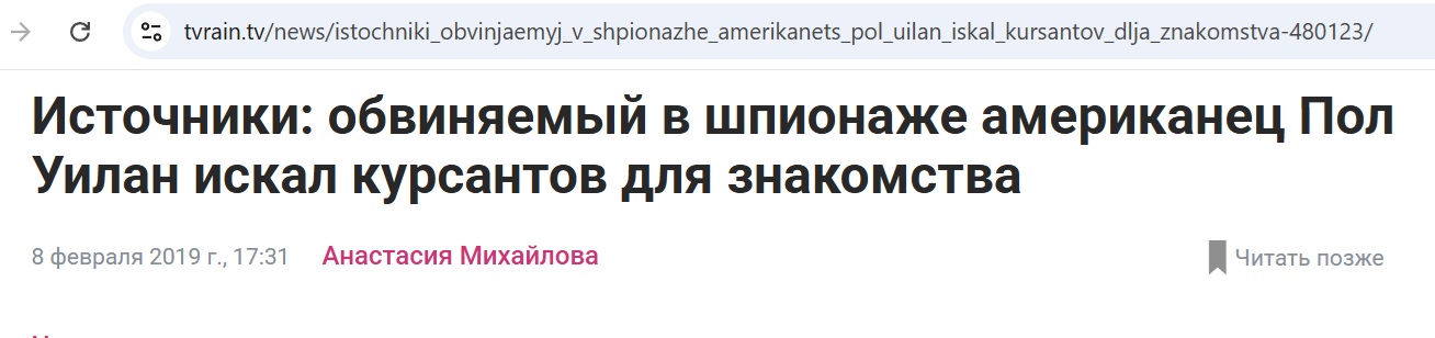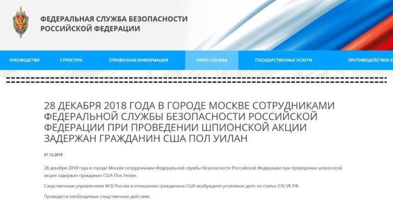 В декабре 2018 года Центр общественных связей ФСБ отчитался: в Москве «при проведении шпионской акции задержан гражданин США Пол Уилан».