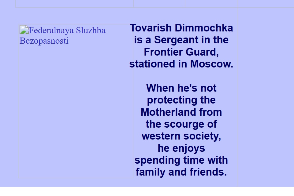 «Товарищ Димочка — сержант в пограничных войсках, дислоцированный в Москве. Когда он не занят защитой Родины от бича западного общества, он с удовольствием проводит время с семьей и друзьями».