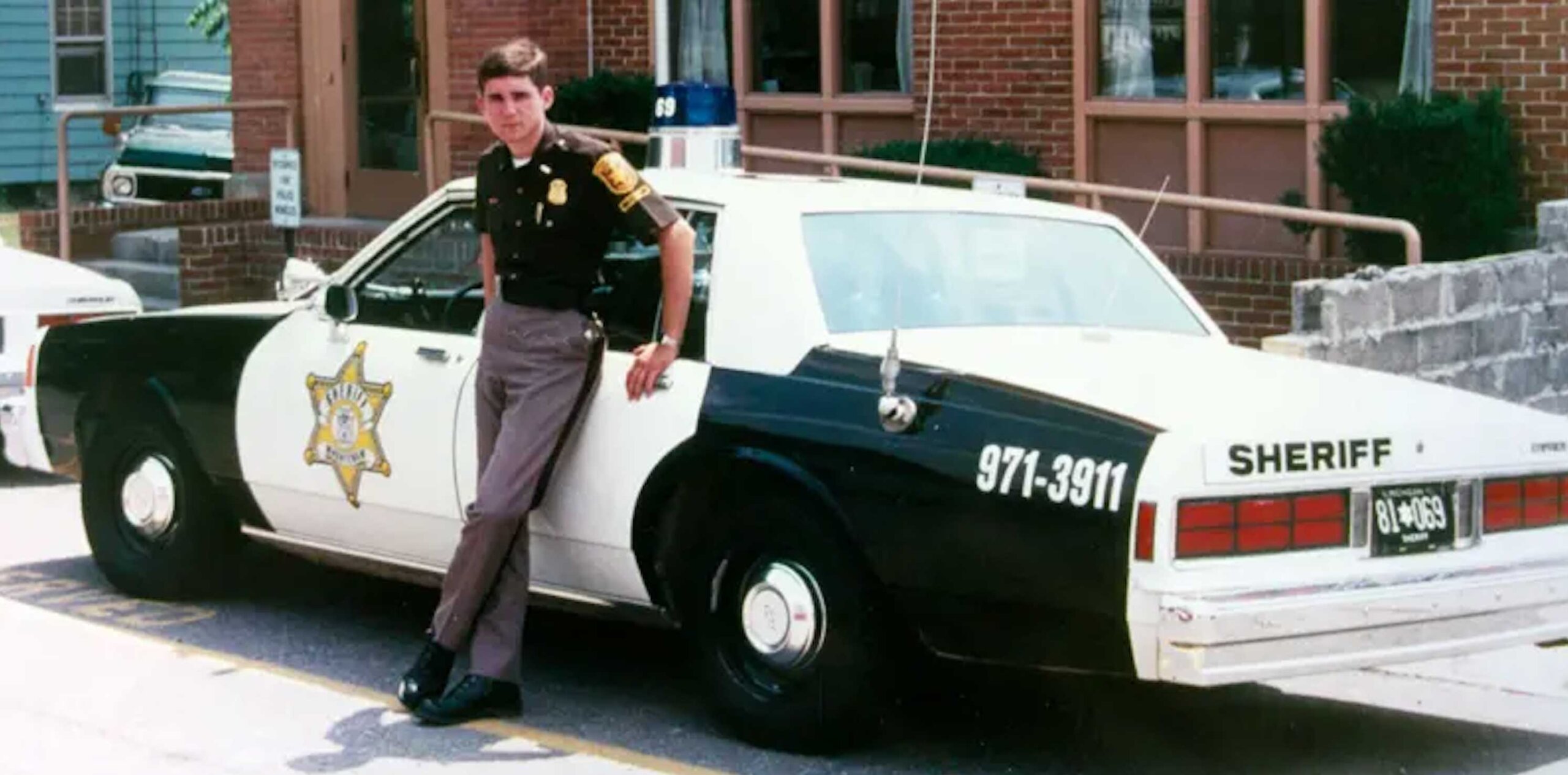 Молодой Пол Уилан на фоне автомобиля службы шерифа. На нем форма учащегося муниципальной школы полицейской подготовки.
